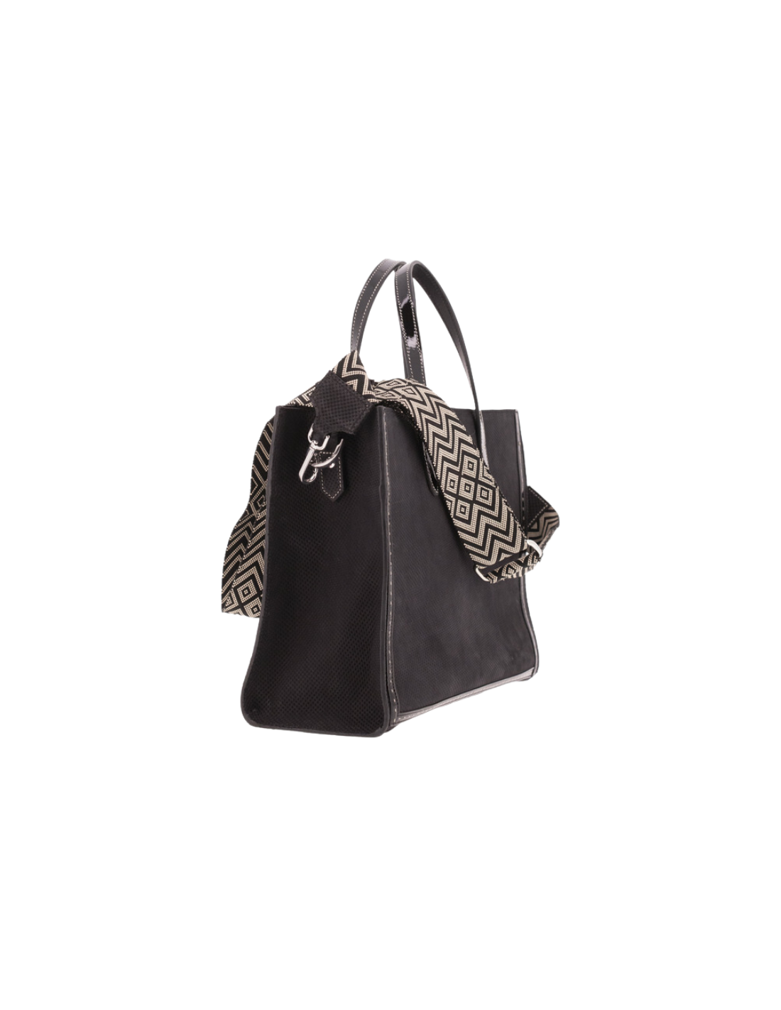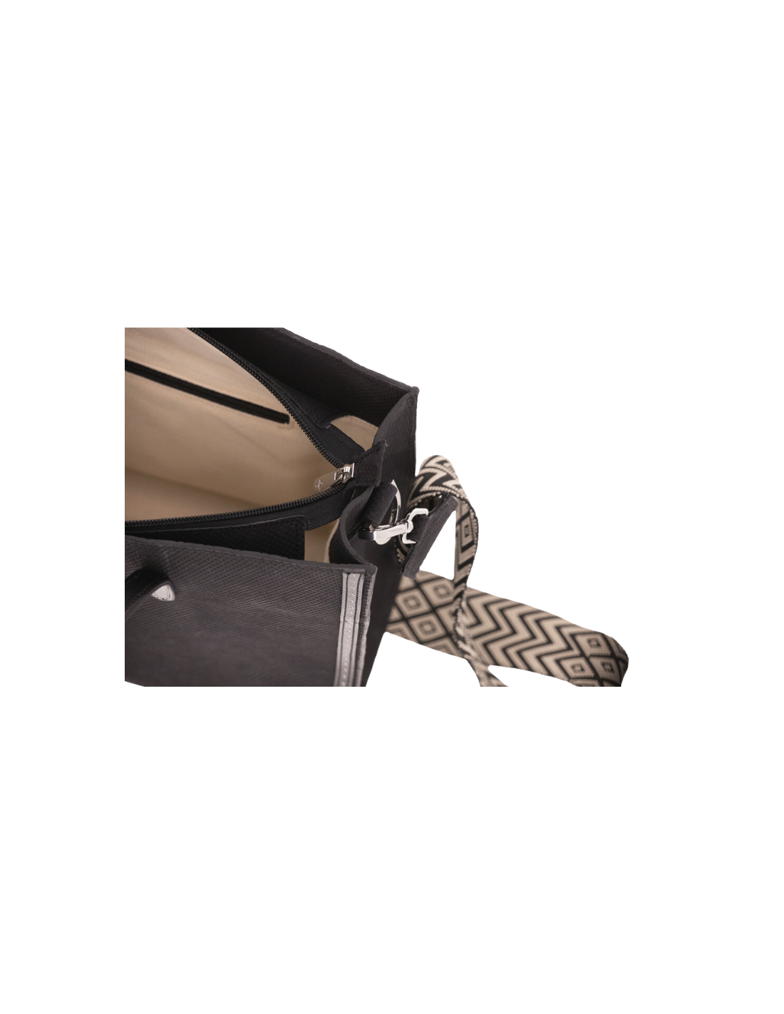 Le sac Romane est également équipé d'une grande anse réglable à motifs chevrons, offrant la polyvalence d'un porté à l'épaule ou en bandoulière.