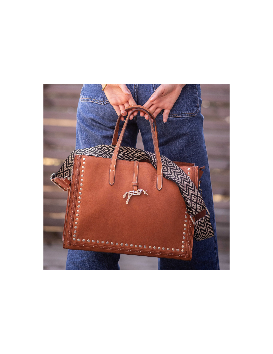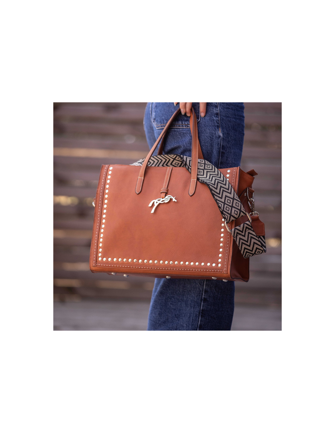 Confectionné dans un cuir lisse haut de gamme, il est sublimé par un galon point sellier ton sur ton et un délicat rang de clous plats à l’intérieur, pour une finition sophistiquée jusque dans les moindres détails.