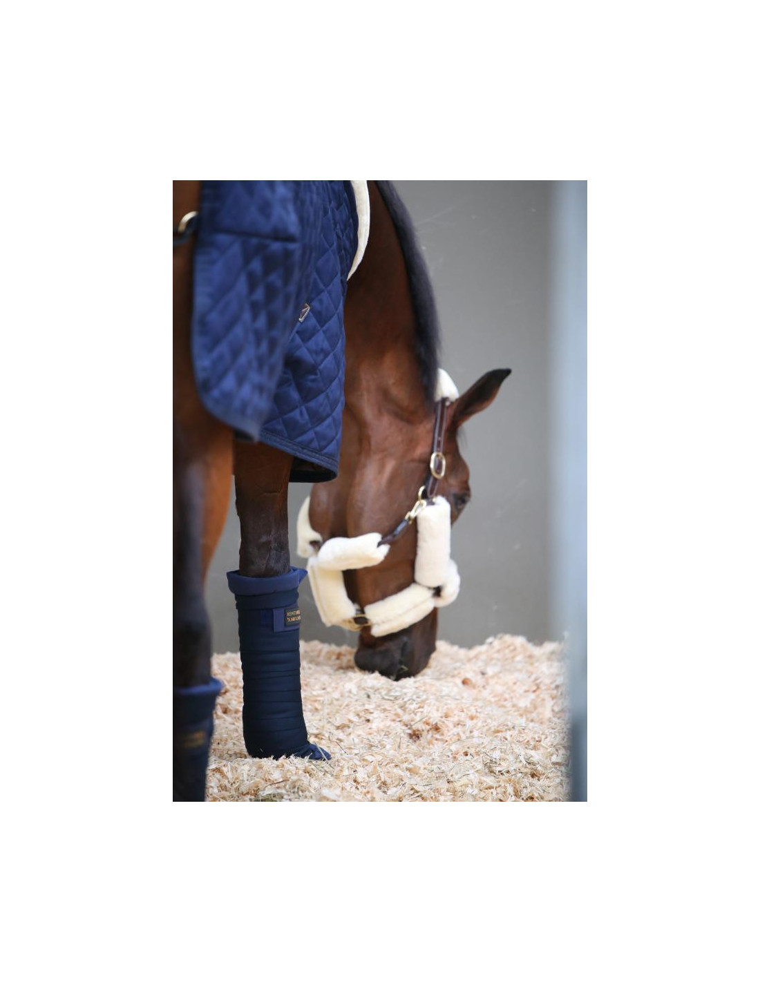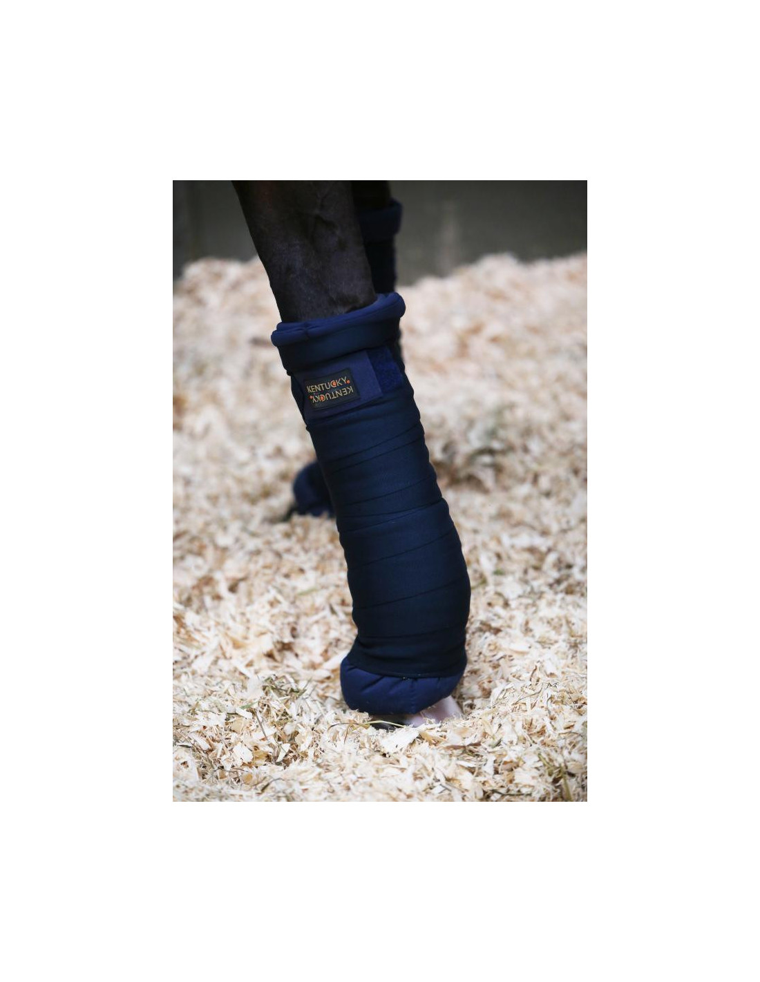 Donc aujourd'hui je vous présente un produit de la marque Kentucky, qui sont les bandes de repos élastiques. Avec la marque Kentucky Horsewear qui ne se voit pas trop, mais personnellement, je trouve ça bien. Elles sont faites à partir d'une matière en fibres douces, mais je les trouve robustes donc je suis quand même assez surprise parce qu’elles sont très respirantes, on peut le voir parce qu'elles sont assez transparentes. La fermeture est en velcro, robuste aussi. Très bien, très important aussi pour les chevaux. Donc ces bandes ont la spécificité de ne pas s'accrocher aux copeaux, vraiment je trouve ça top !