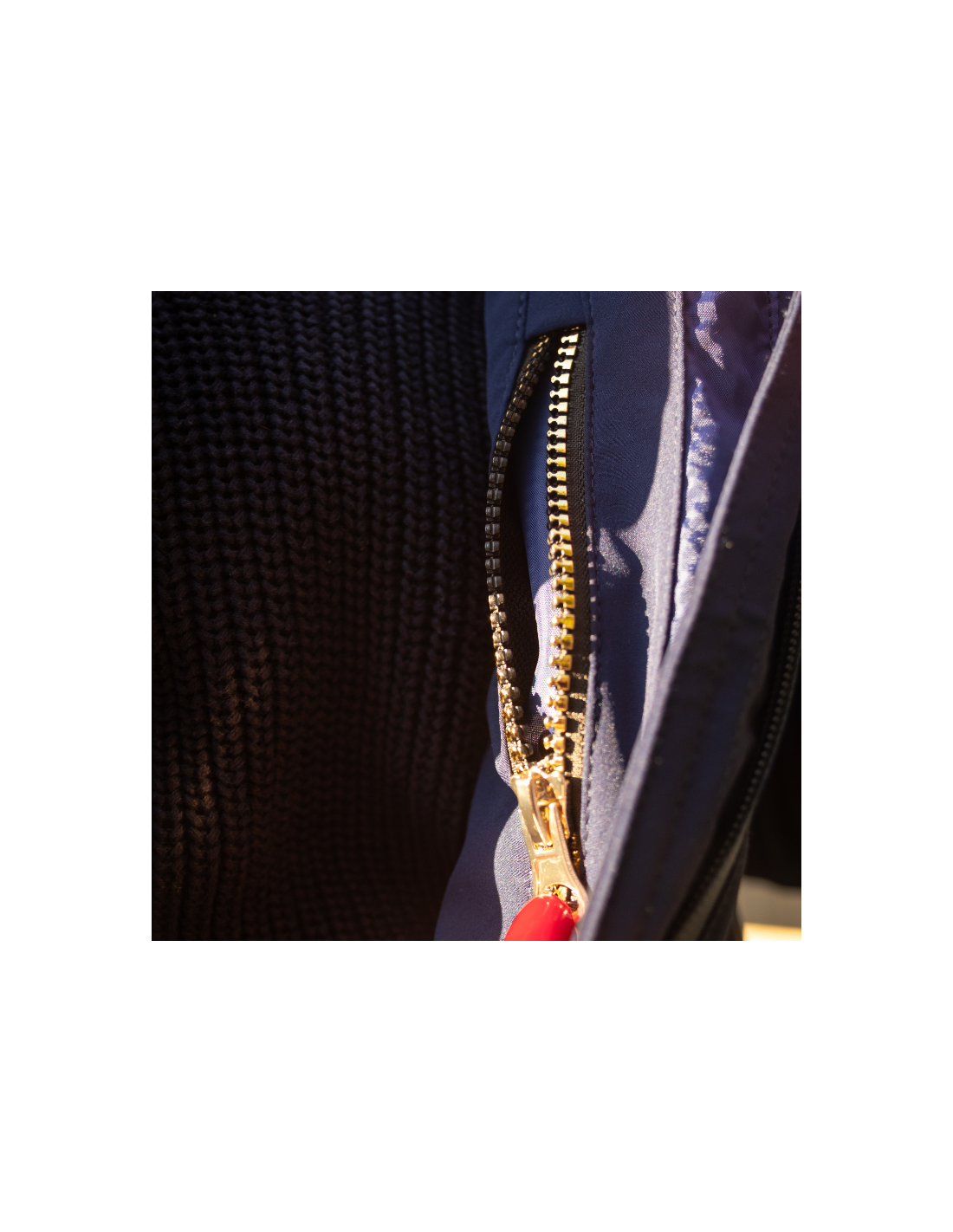 Son coloris marine profond et son zip central discret lui confèrent une allure à la fois sobre et raffinée.