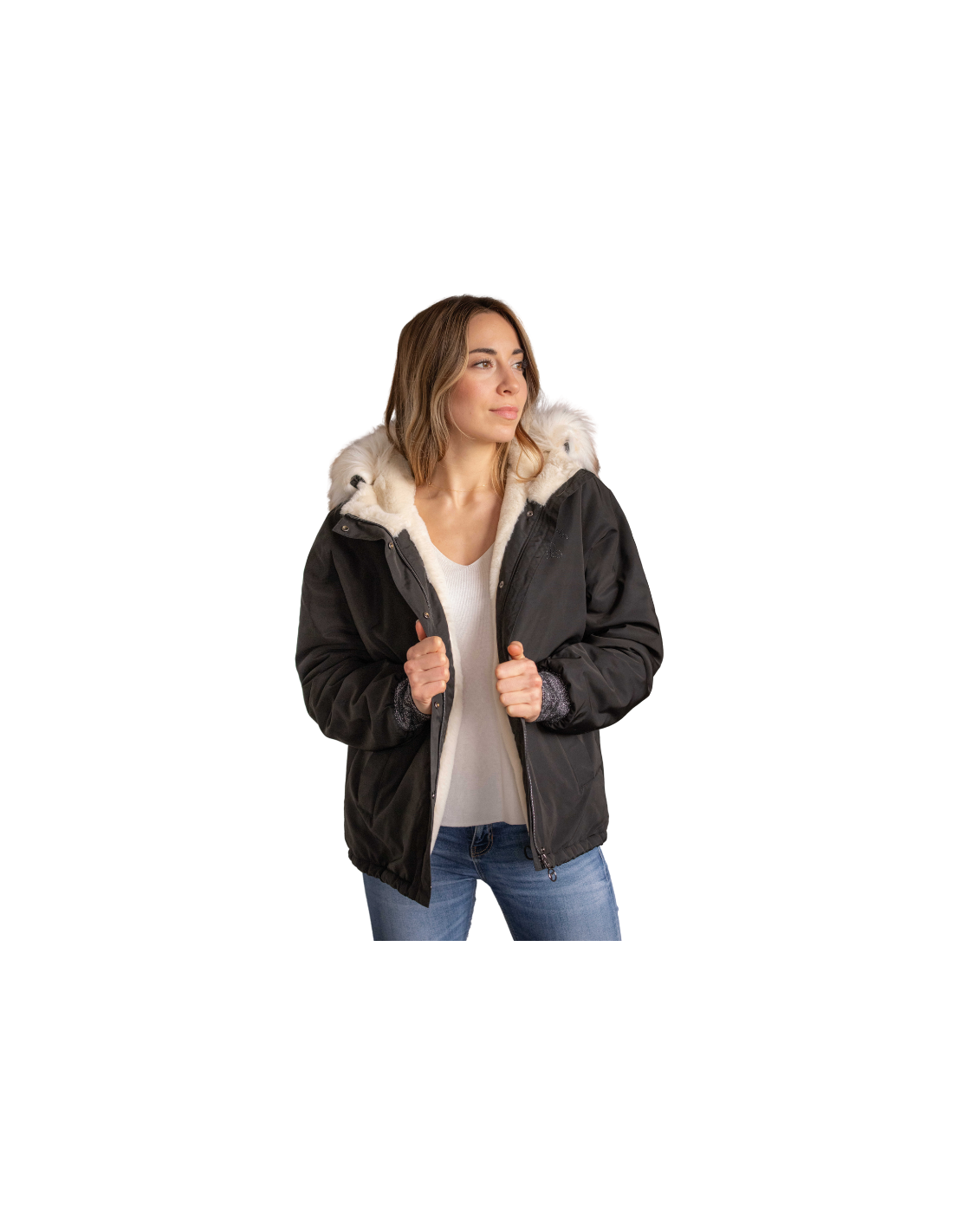 Sa forme boule resserrée à la taille offre une silhouette moderne et confortable, tandis que sa doublure intégrale en fausse fourrure off white, y compris dans la capuche bordée de fourrure synthétique, assure une isolation optimale.