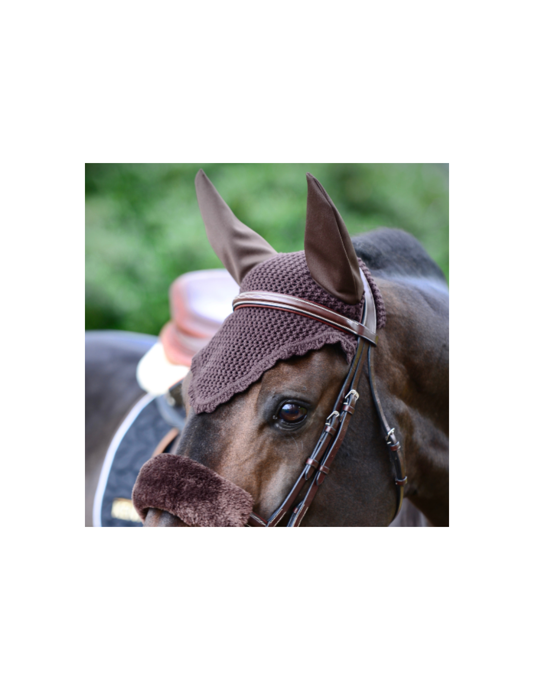 Ce bonnet protège les oreilles du cheval contre les mouches durant le travail.
