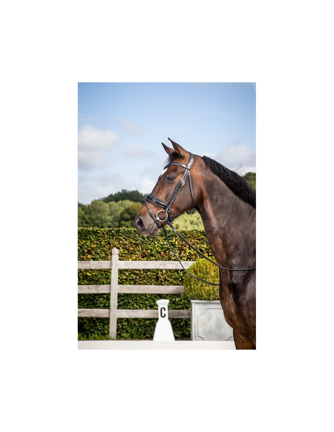 Ce superbe bridon de dressage se distingue par son frontal souple en V qui est légèrement bombé.