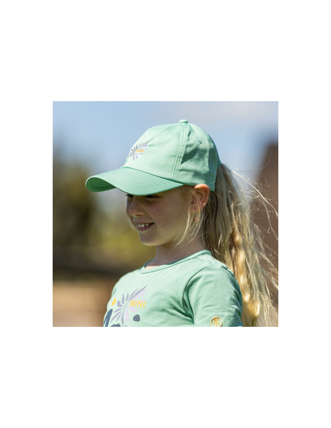 La casquette arbore un design coloré et attrayant, parfait pour les jeunes cavaliers qui souhaitent afficher leur passion pour les chevaux de manière ludique et stylée.