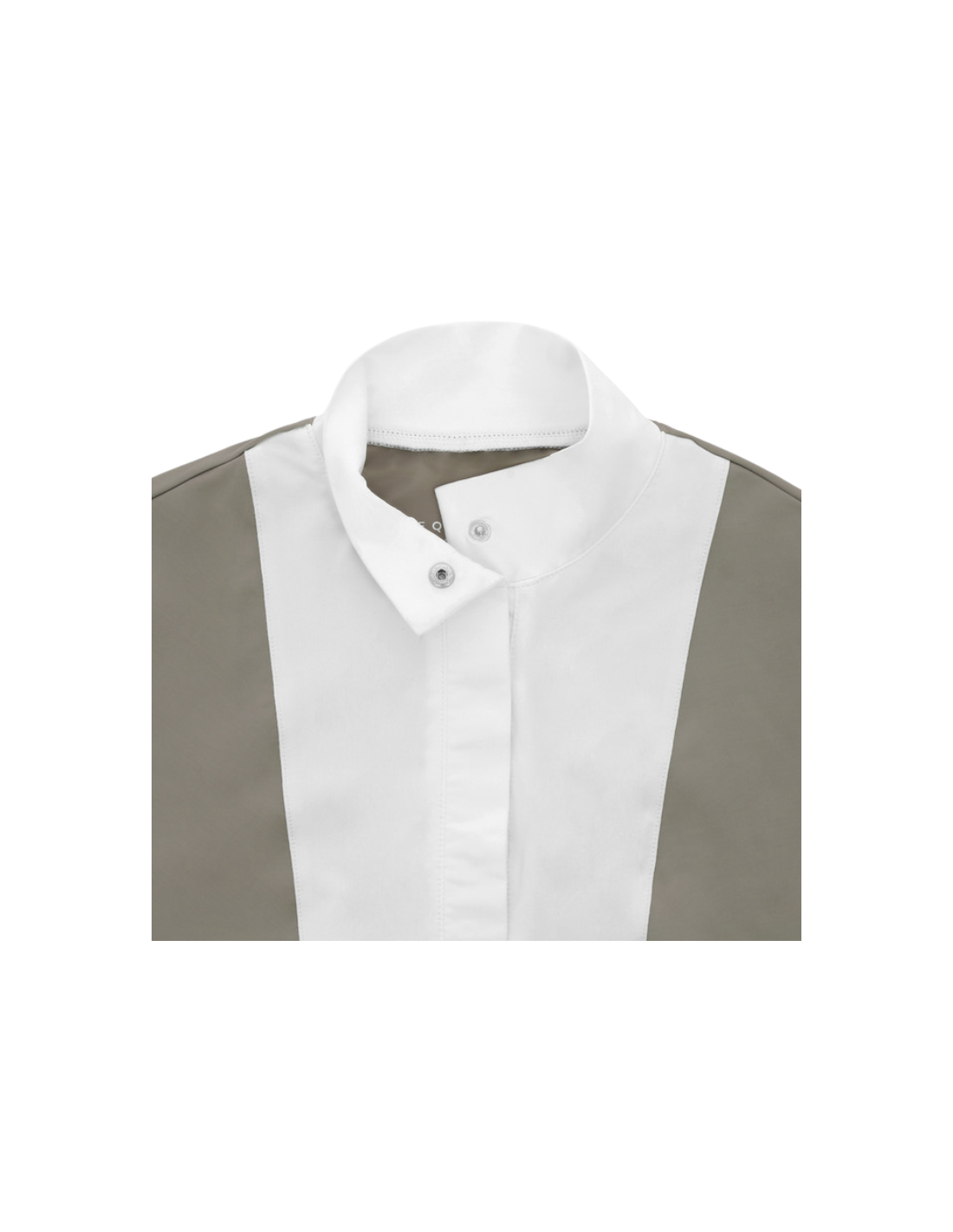 Elle se distingue par son col contrasté blanc en bord côte élastiqué, sa fermeture boutonnée intégrale, ses finitions en popeline au col et aux poignets pour un effet chemise chic, et une coupe ajustée pour une silhouette féminine.