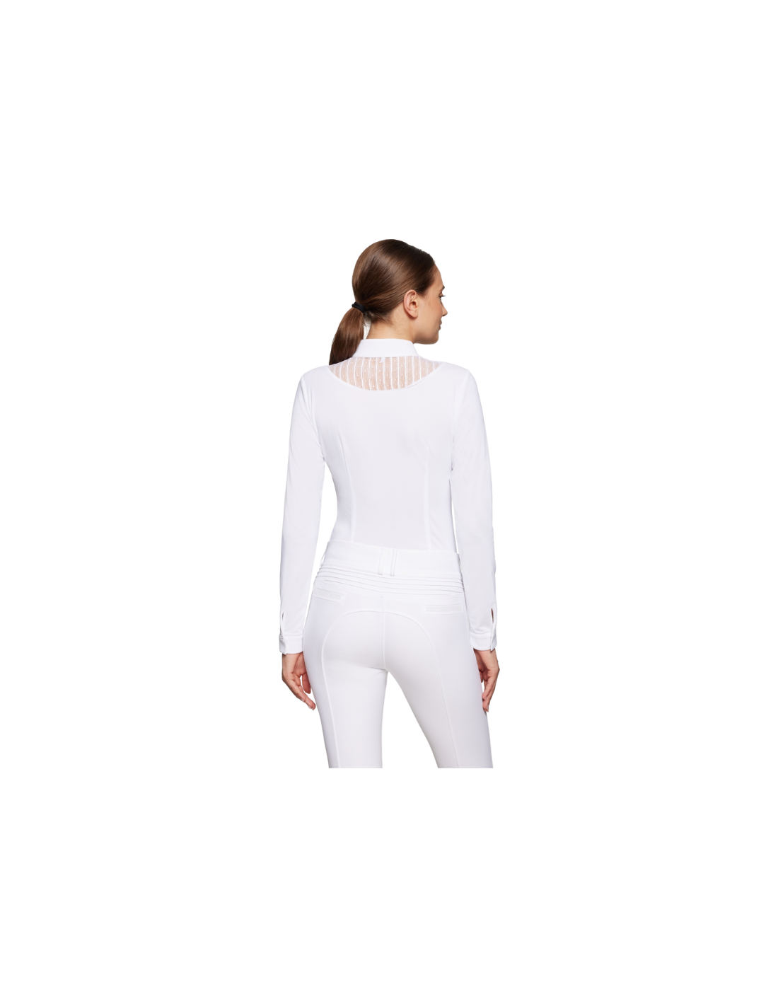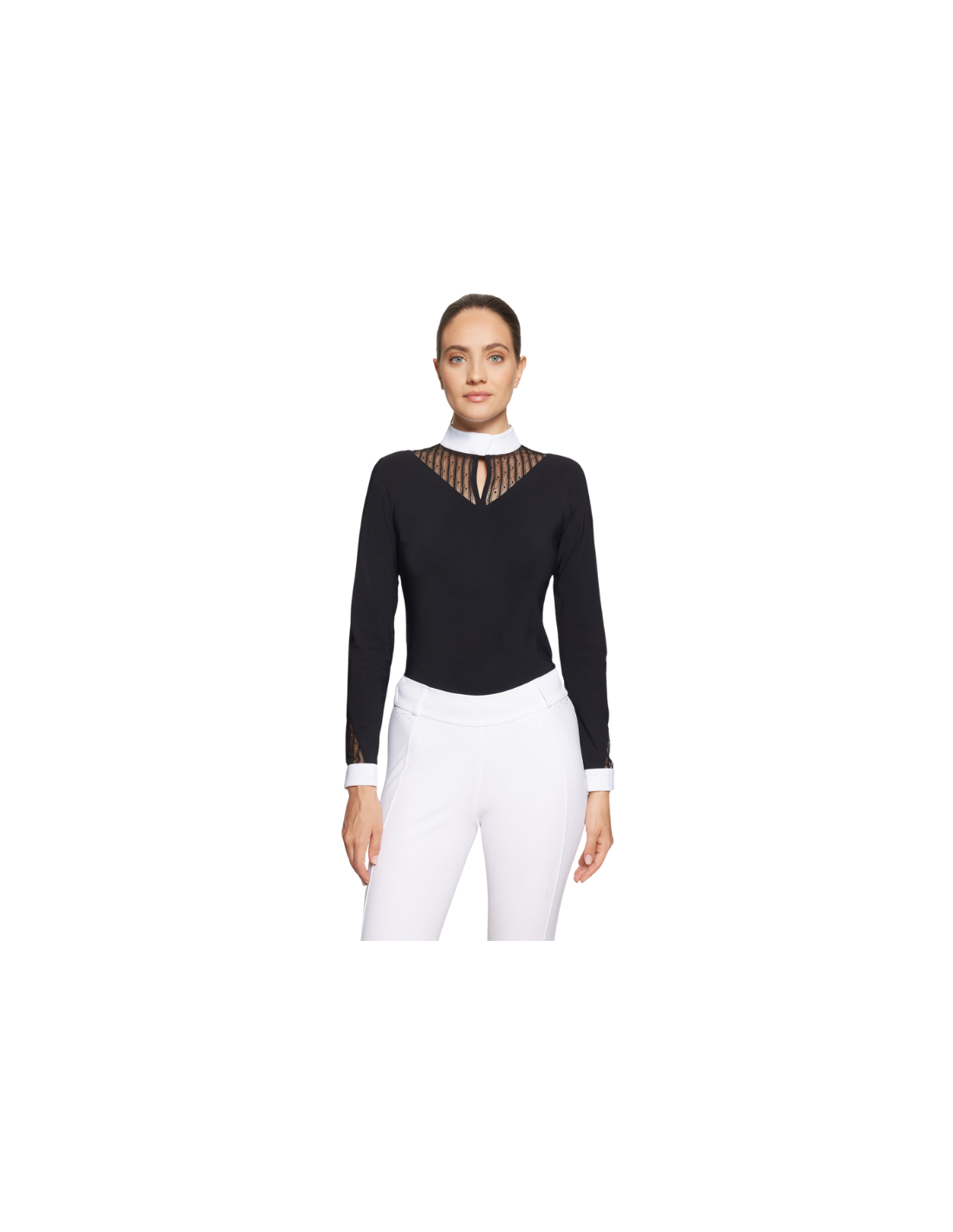 Je vais présenter le polo de concours de chez Samshield, c'est le modèle Béatrice. Rapide à enfiler, il se met à l'aide de deux boutons de pression au niveau du col, qui sont très faciles à mettre. Il a également une matière respirante et agréable au toucher. En plus de ça, le design est super beau. De la dentelle aux manches, ainsi qu’en dessous du col. Il y a également le logo Samshield en Swarovski. Alors n'hésite plus ! Si toi aussi tu veux briller en concours, ce polo est fait pour toi !