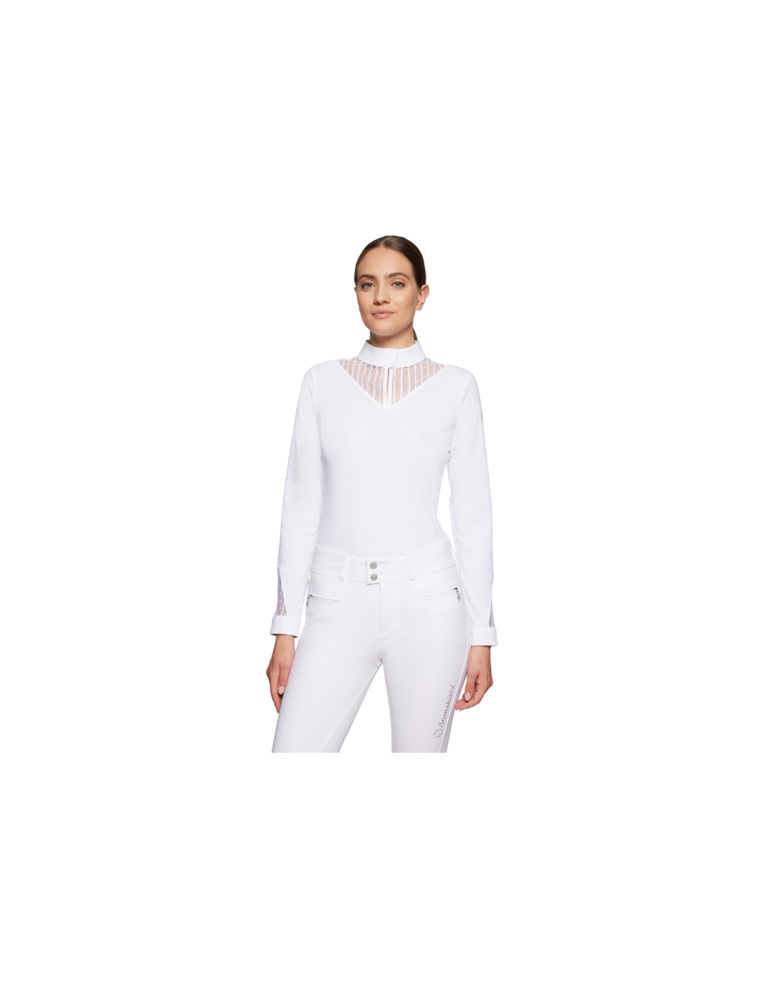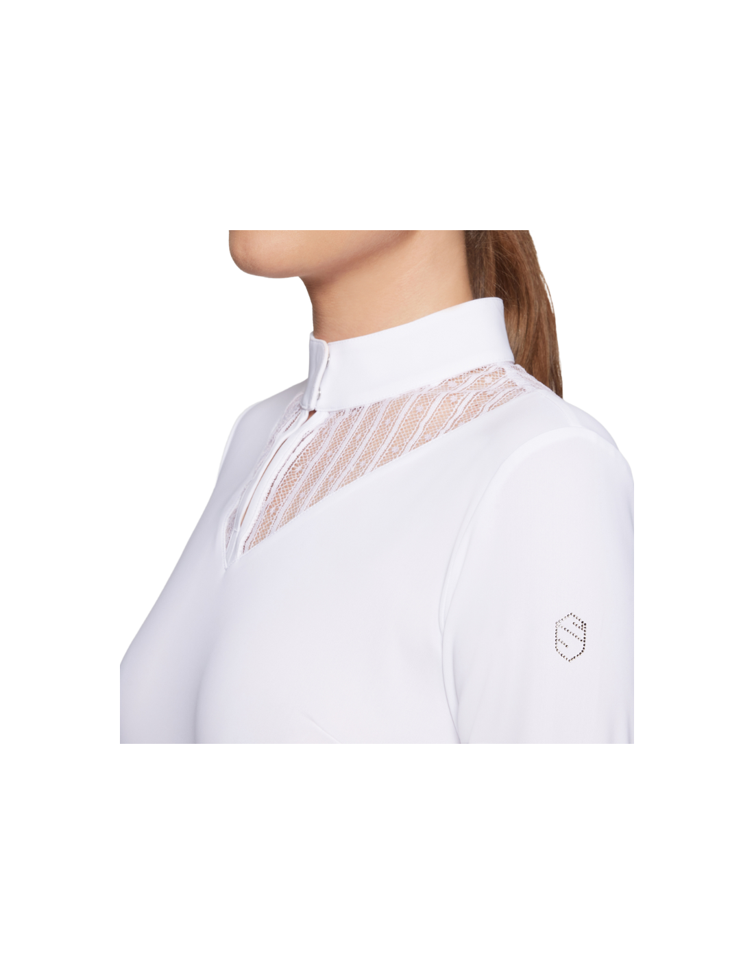 Il assure élégance, féminité et raffinement grâce aux détails tels que la dentelle sur la patte du col, les manches et le dos ainsi que le blason Samshield en cristaux Swarovski sur la poitrine.