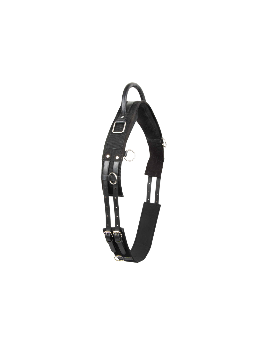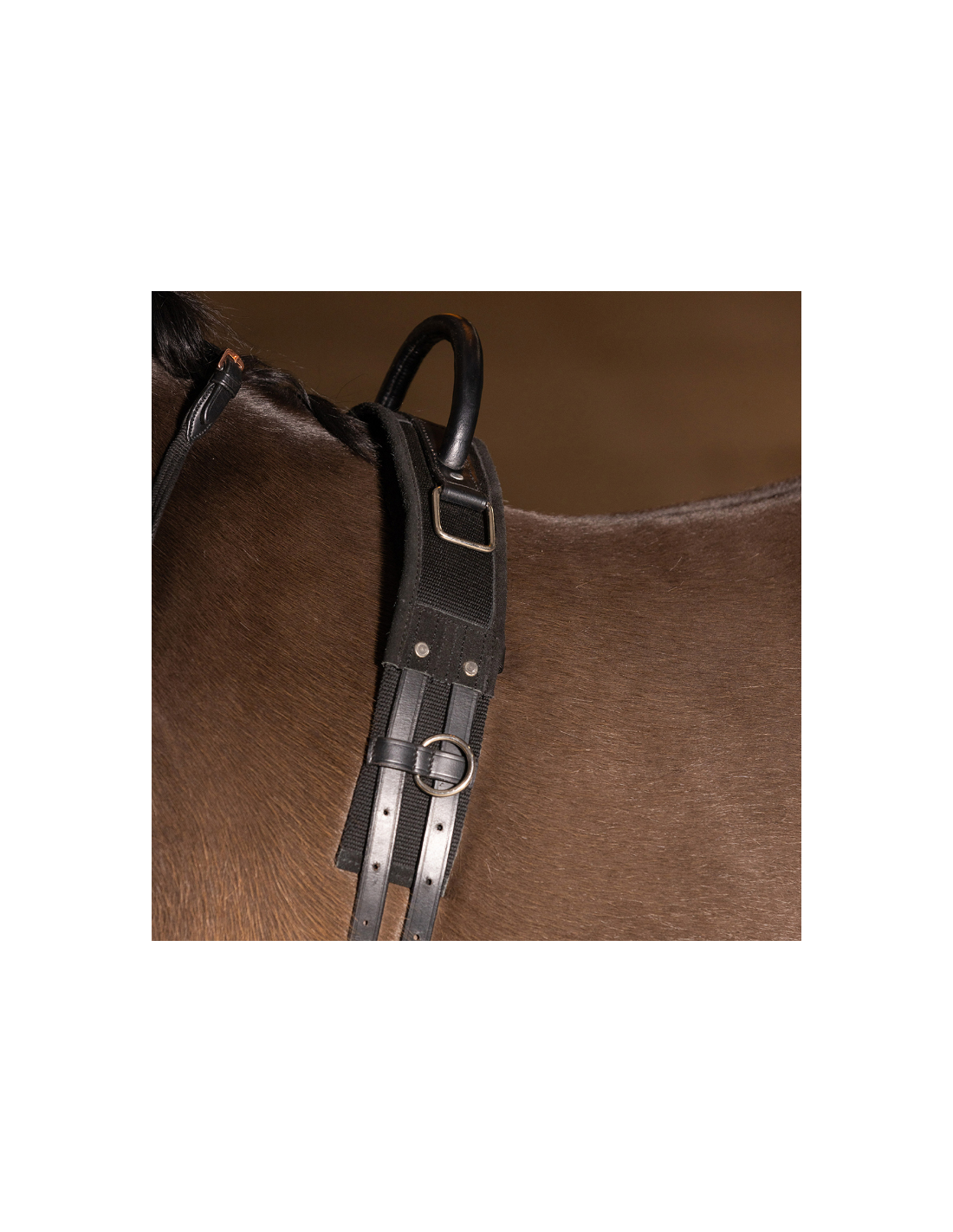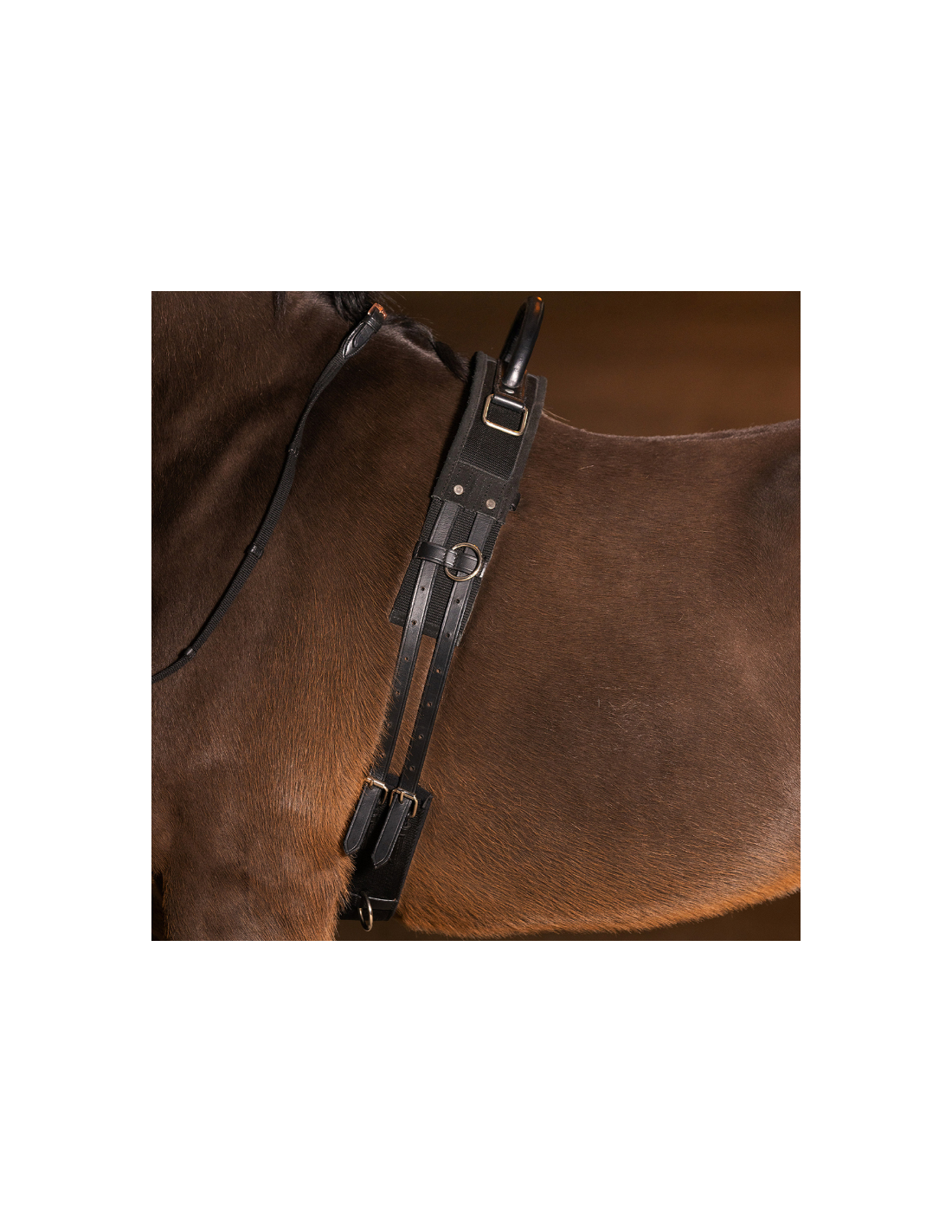 Le surfaix dispose également de plusieurs anneaux latéraux permettant d’ajouter des enrênements ou du matériel de travail, ainsi que de crochets carrés conçus pour y fixer des étriers selon les besoins de l’entraînement.