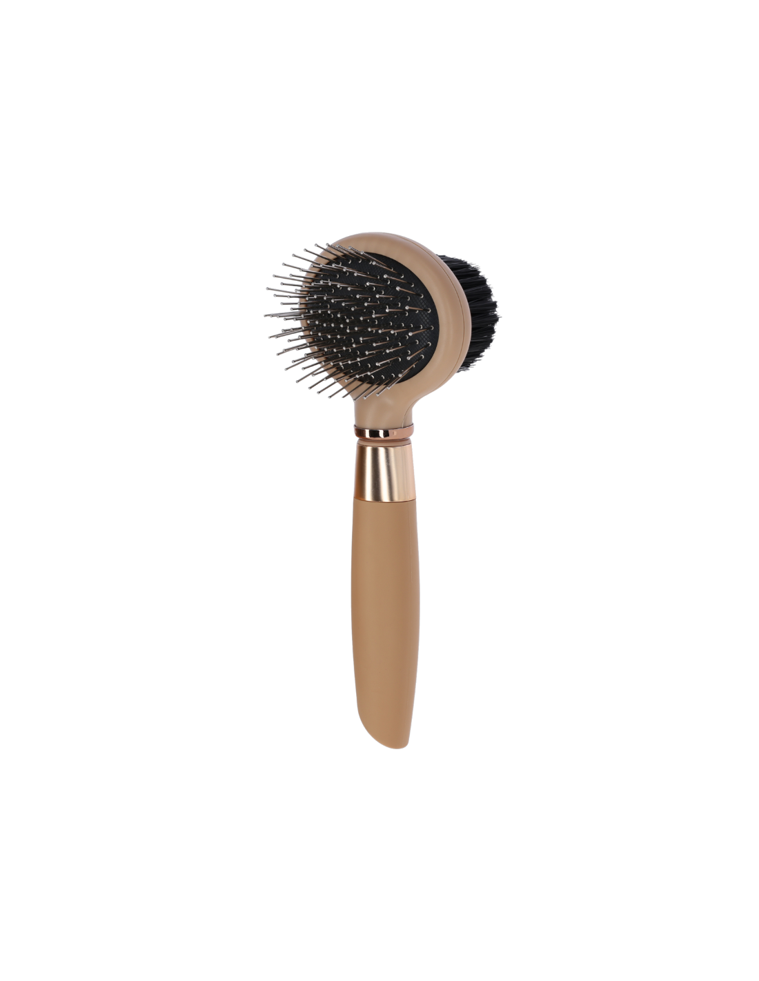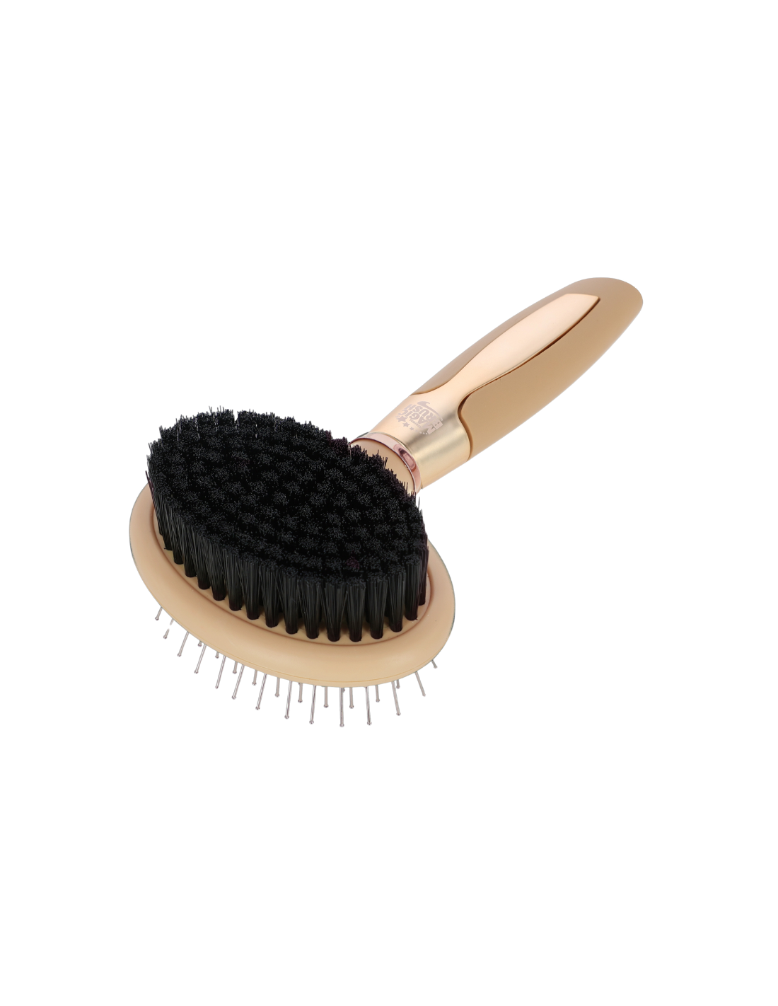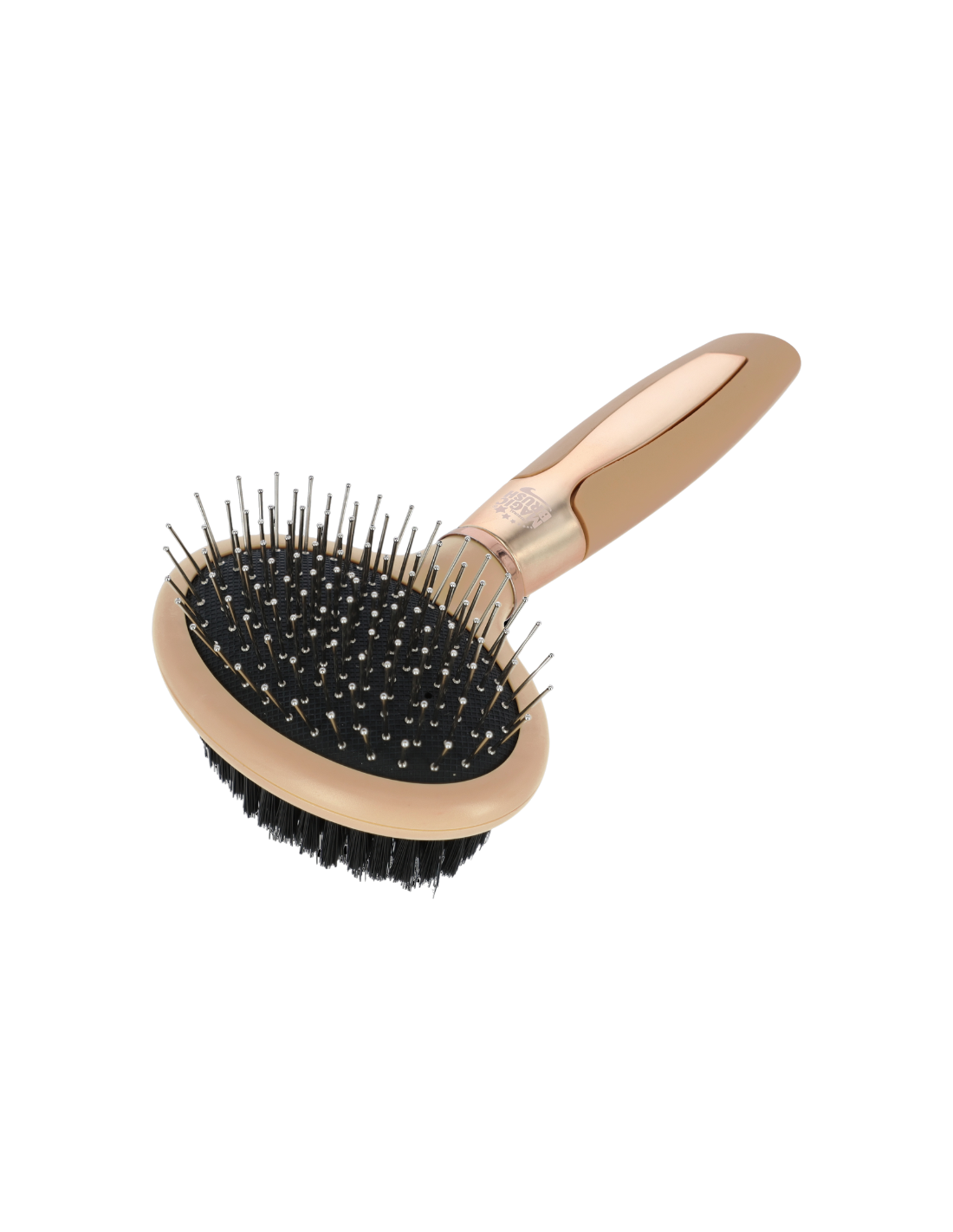 Picots arrondis en acier inoxydable d'une part et poils synthétiques doux d'autre part.